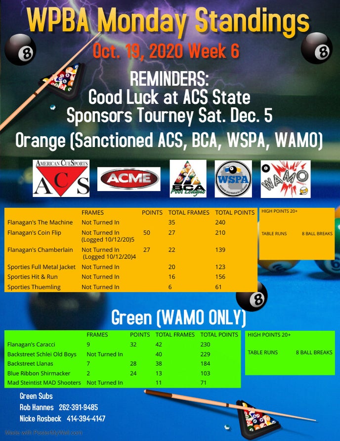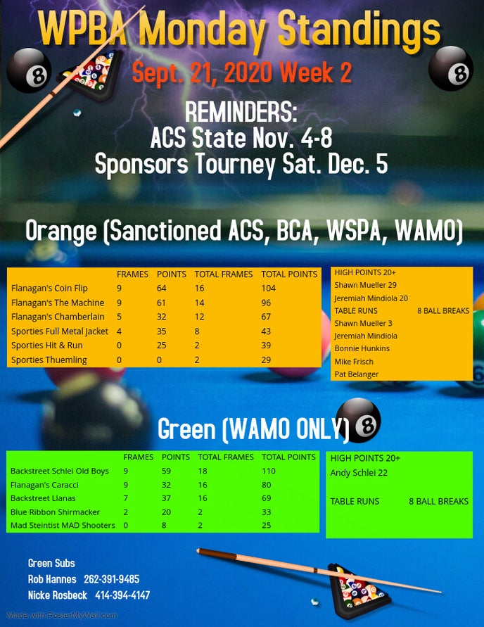 Please drop off weekly score sheets by noon on Thursday at Sporties or Backstreet.